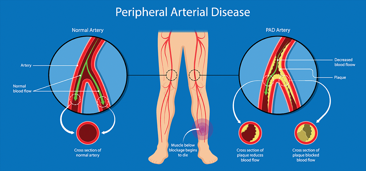 Peripheral Arterial Disease (PAD), is caused by gradual narrowing of blood vessel supplying upper limb, lower limb (legs), brain, stomach intestine and kidneys. It commonly involves lower limb. This leads to a reduction in blood flow to the extremities, causing a range of symptoms.